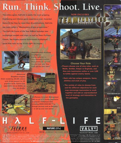 -. Binding : Video Game -. Brand : Vivendi Universal -. EAN : 0020626715409 -. Edition : Game of the Year -. ESRBAgeRating : Mature -. Feature : Enemy AI: Half-Life's monsters are also remarkably--even terrifyingly--intelligent. Our proP.R.Ietary / Rendering Technologies: So you don't want to have to buy a special hardware accelerator just to get / Skeletal Animation System: Our new animation system lets us create monsters that are more spectacula / Multiplayer: Joining a multiplayer game is now fast and easy, thanksto Half-Life's powerful interfac / Hazard Course training area for practicing movements, special maneuvers, and weapons use -. Format : CD-ROM -. Genre : Action Games -. HardwarePlatform : Pc -. IsAutographed : 0 -. IsMemorabilia : 0 -. Label : Vivendi Universal -. Manufacturer : Vivendi Universal -. Model : 70863 -. MPN : 70863 -. NumberOfItems : 1 -. OperatingSystem : Windows 2000 -. PackageQuantity : 1 -. PartNumber : 70863 -. Platform : Windows 98 / Windows 2000 / Windows Me / Windows 95 / Windows NT -. ProductGroup : Video Games -. ProductTypeName : SOFTWARE_GAMES -. Publisher : Vivendi Universal -. ReleaseDate : 1999-06-28 -. Studio : Vivendi Universal -. Title : Half-Life: Game of the Year Edition - PC -. UPC : 020626708630
