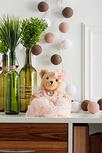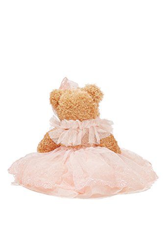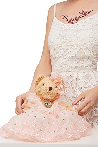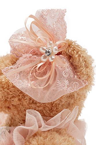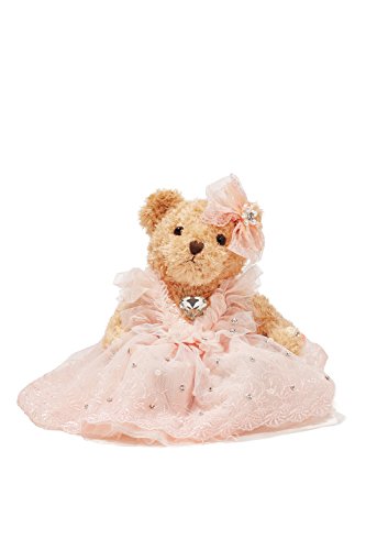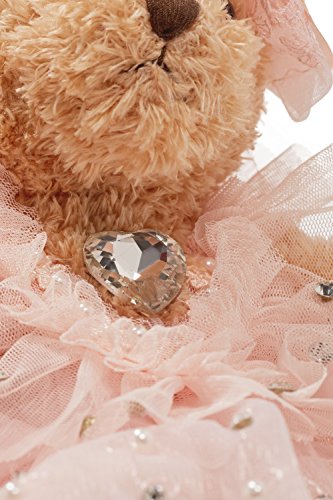 Lovely stuffed bear in a pink wedding dress decorated with crystals, faux pearls, embroidery and lace. The toy comes with a little hanging loop on the top of the head. Great start of a teddy bear collection and marvellous addition to the existing set.