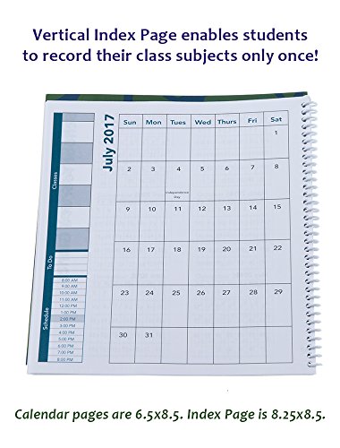 IT PUTS THE STUDENT IN CONTROL. A unique index page at the front of the planner enables students to record their school subjects ONLY ONCE. Eliminating forgetfulness and frustration! Begins July 2017-June 2018. Overall planner size is 8.5x8.25, calendar pages are 6.5x8.5.