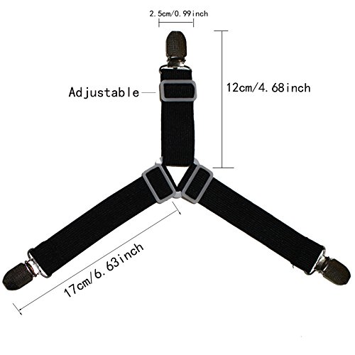 Adjustable SIZE :Natural Length:12cm-17cm/4.68-6.63 inch,Can Stretch,allows desired tension. Width: 2.5cm/0.99inch, Fits with fitted sheet and flat sheet , Easy to put on and keeps corners in place and no more worries.Triangle design-Provides stable and stronger grip,keep sheets away from messy or wrinkled, eliminate the sliding of bed sheets with these sheet fasteners