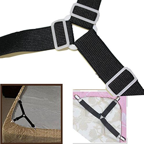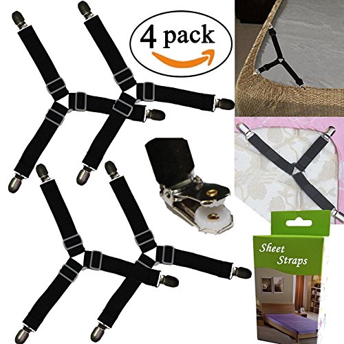 PACKAGE INCLUDE : 4pcs/set High Quality Triangle Bed Sheet Fastener Suspenders Adjustable Bed Sheet Straps Corner Holder Elastic Straps Fasteners Clips Grippers Mattress Cover Suspenders , Nickel Plated Clamps with Fabric Protector . Bed sheet Straps works with ALL types of bedding .Simple bedside installation