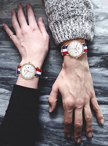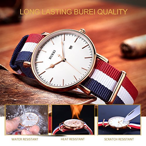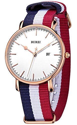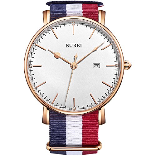 BUREI Unisex Simple Fashion Quartz Watch White Analog Dial Rose Gold Stainless Steel Case Nylon Strap