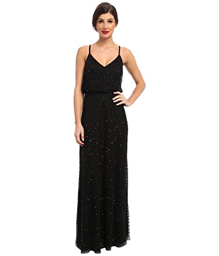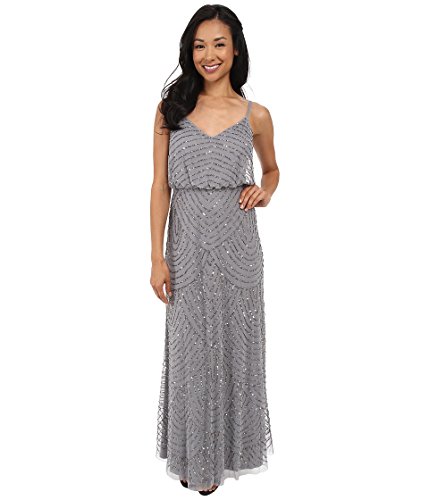 Floor-length dress in allover art deco-inspired beading pattern featuring blouson bodice with V-neckline