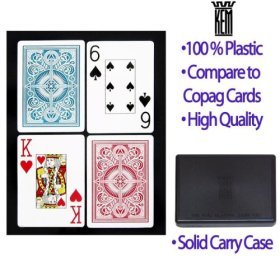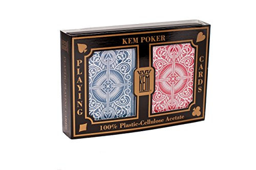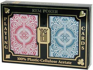 Amazon.com These playing cards from KEM are made of 100 percent cellulose acetate plastic--a unique blend of paper and plastic that provides superior flexibility and strength. The cards are scuff- and break-resistant and completely washable, and are designed to deliver the classic snap and feel of paper with the exceptional durability of plastic. Included in this set are two decks (one red, one blue) of poker-sized playing cards (3 1/2 inches by 2 1/2 inches). The cards come with a durable storage case made of hard plastic. Each deck contains one joker. About KEM Plastic Playing Cards KEM Plastic Playing Cards is a 60-year-old company specializing in one product: playing cards that are 100 percent cellulose acetate plastic. KEM plastic playing cards contain no vinyl, which is the raw material used by other playing card manufacturers for their "plastic" playing cards. KEM cards can handle the wear and tear like no other brand of card in the industry. KEM's high-performance cards are designed to last longer, shuffle better, and deal in such a manner that you will never want to play with other cards again. 0