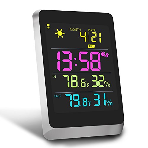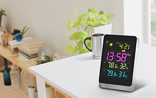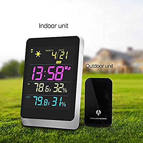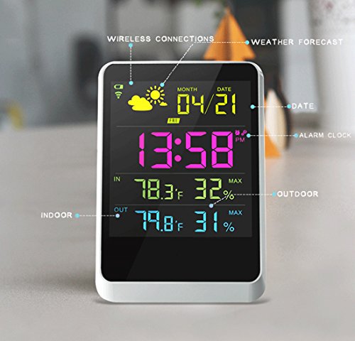 The wireless weather station has the most comprehensive information of weather. To plan your day will no longer under assumption, but base on accurate information! Large LED screen with artful design for great viewing! Wireless temperature transmits from weather resistant outdoor sensor, within 330 ft range. It detect and transmit latest temperature & humidity per 35 seconds under working mode. Definitely good partner in your life!Color Weather Station: