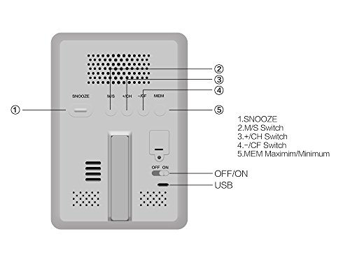 ✔FUNCTION: Double alarm function, Snooze function. 4 Level Weather Forecast Indicator Icon: Sunny, Cloudy, Rainy and Partly Sunny.