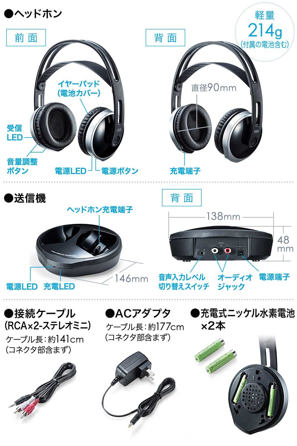 # Set contents: headphone body, transmitter, AC adapter (cable length: approximately177cm), rechargeable nickel hydrogen battery × 2, connection cable (RCA × 2 - stereo Mi, cable length: approximately141cm)