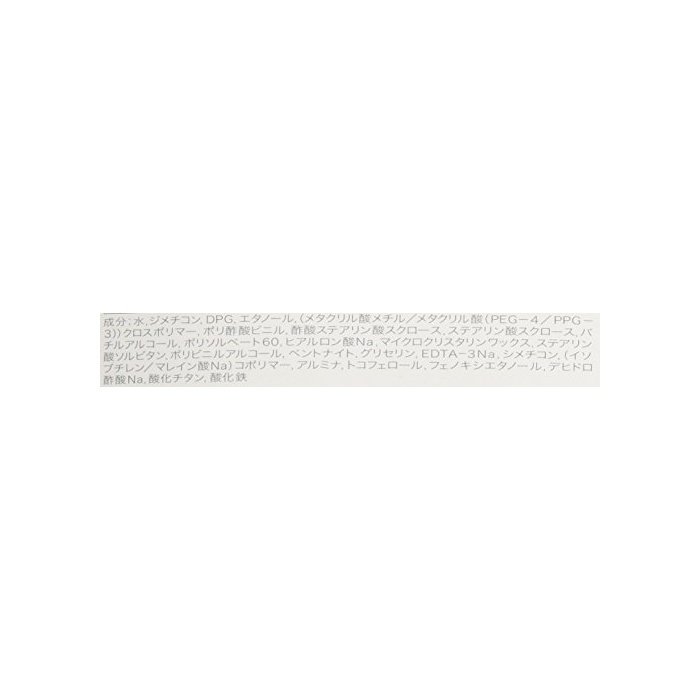 전성분 : 수,더《메치콘》,DPG,에탄올,(메타크릴산 메칠/메타크릴산(PEG-4/PPG-3))크로스 중합체,폴리 초산 비닐(vinyl),초산 스테아린산《스쿠로스》,스테아린산《스쿠로스》,벌《루아루코루》,폴리 솔 베이트60,히알론산Na,마이크로 크리스《다린왓쿠스》,스테아린산 솔《비탄》,폴리 비닐(vinyl) 알코올,벤트 나이트,글리세린,EDTA-3Na,더《메치콘》,(ISO《부치렌》/말레이 인산Na)《고포리마》,알루미나,토코 phenolic,회 노《기시에타노루》,데《히도로》초산Na,산화 살짝《》,산화철