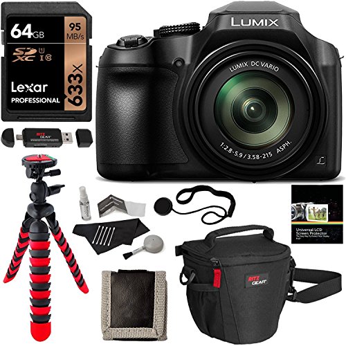 Panasonic FZ80 Lumix 4K Long Zoom Camera, 18.1 MP, F2.8-5.9, Power O.I.S with 3" LCD + Lexar 64GB + Camera Bag + Tripod and DC-FZ80K Accessory Bundle