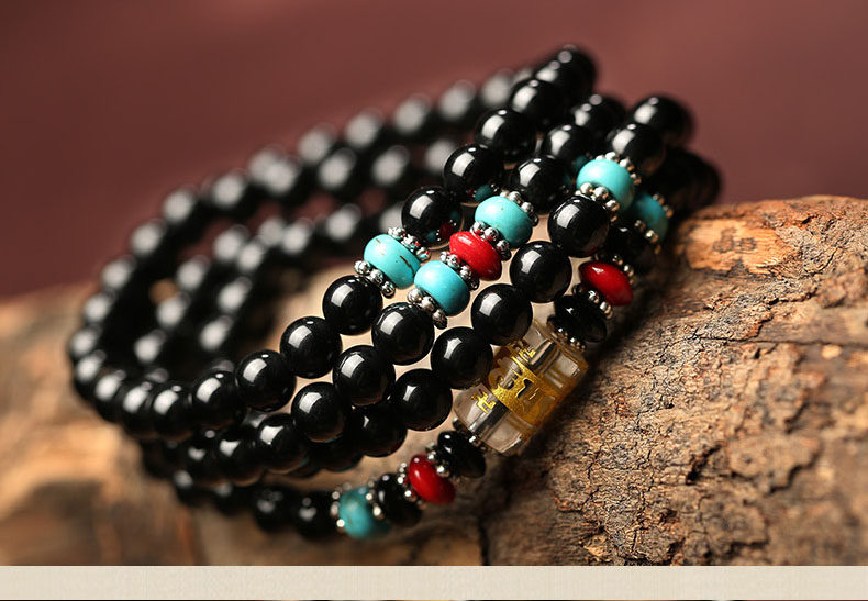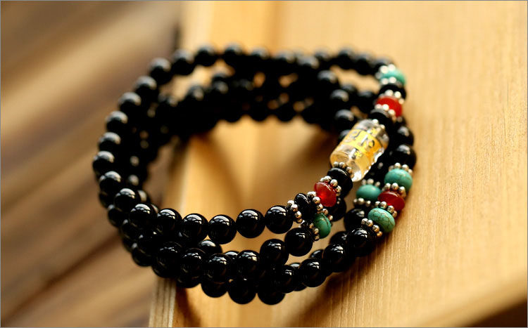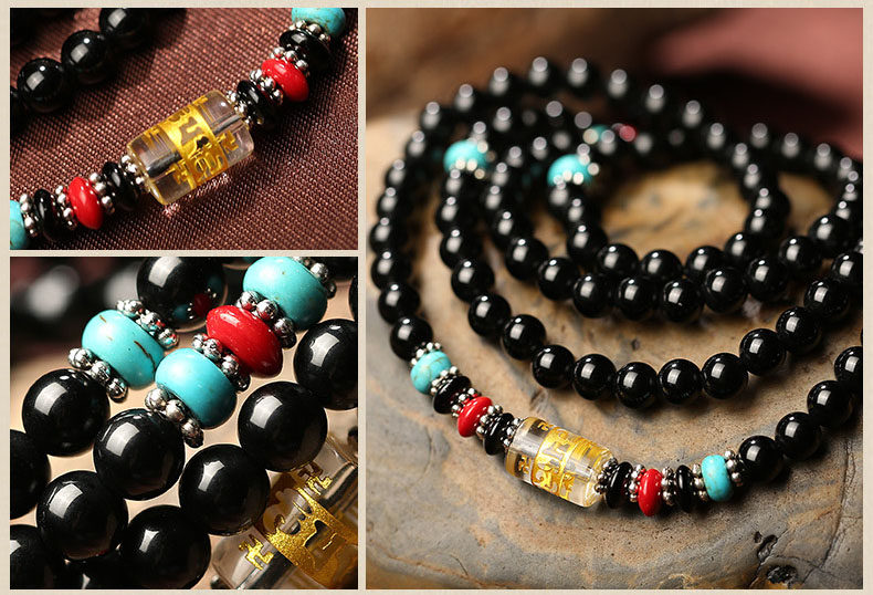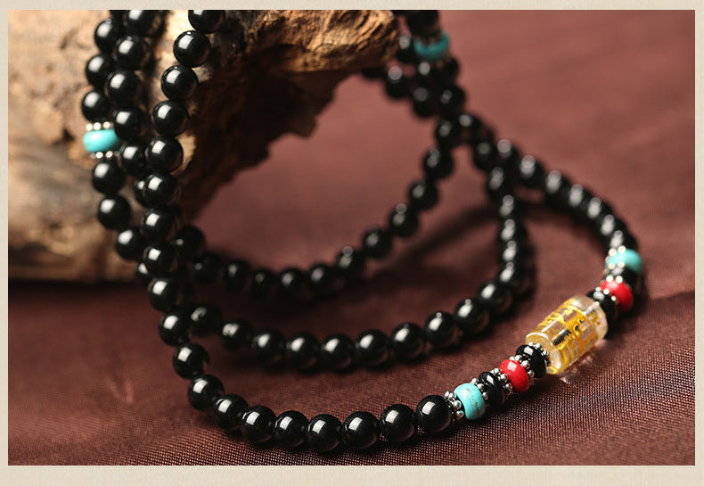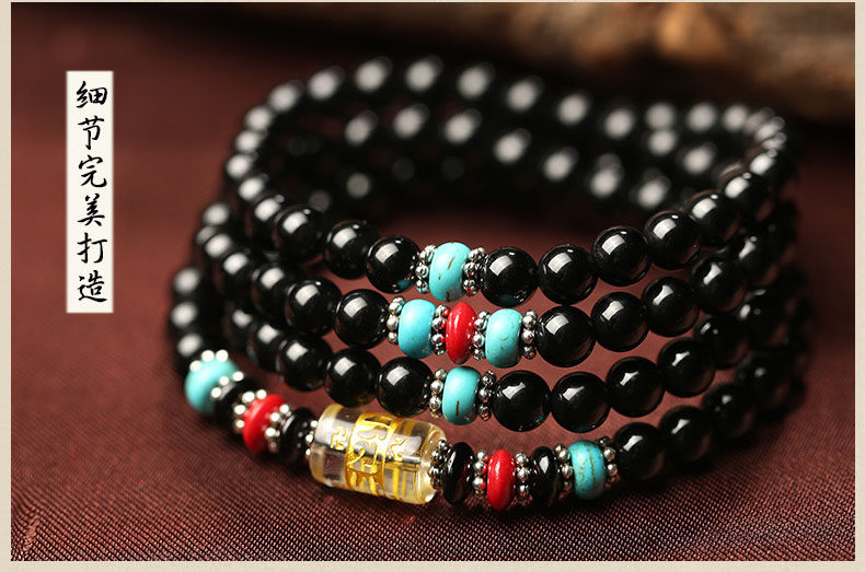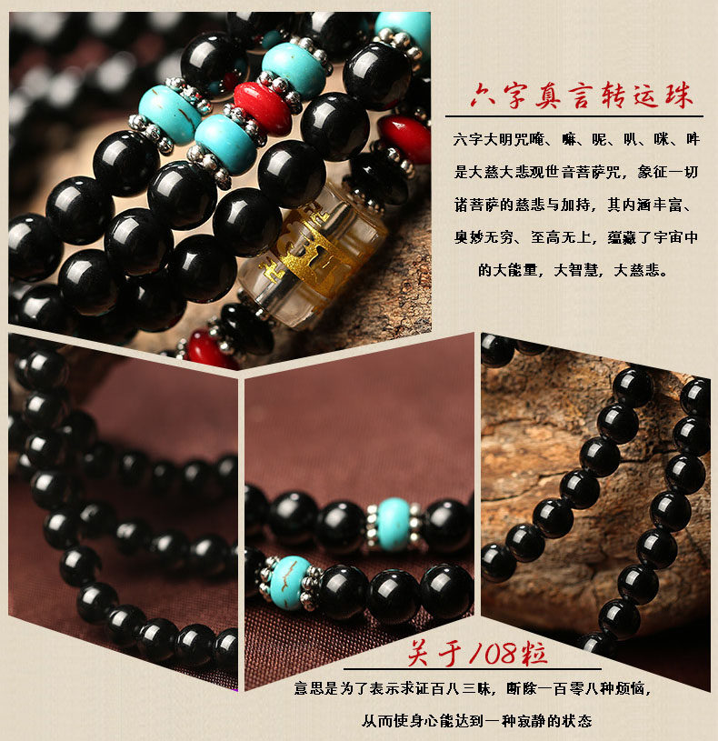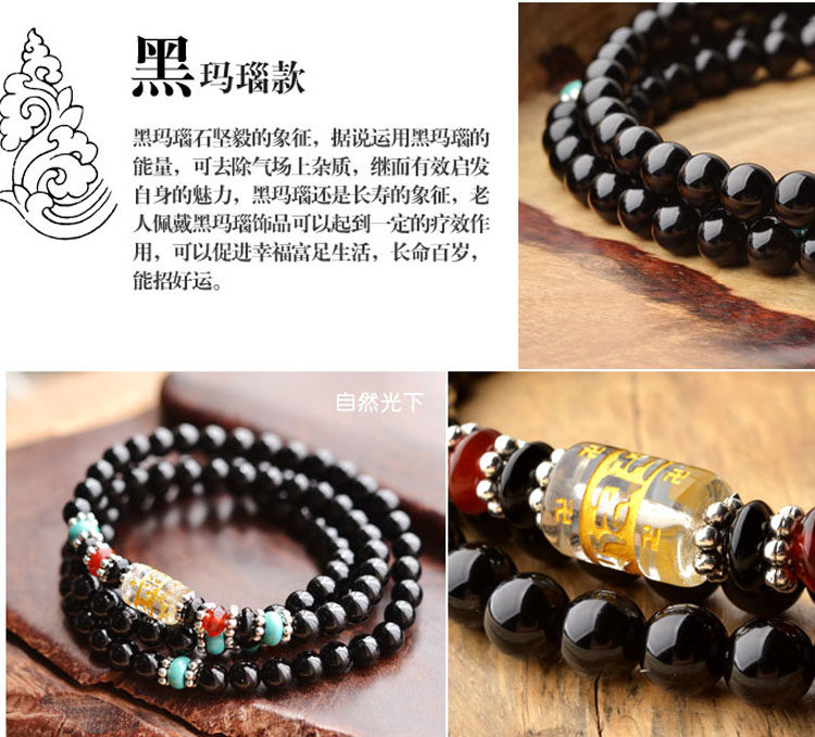 黑曜石六字真言佛珠多圈手链 男女款黑曜石水晶饰品