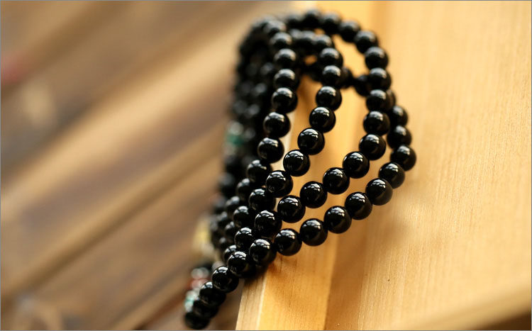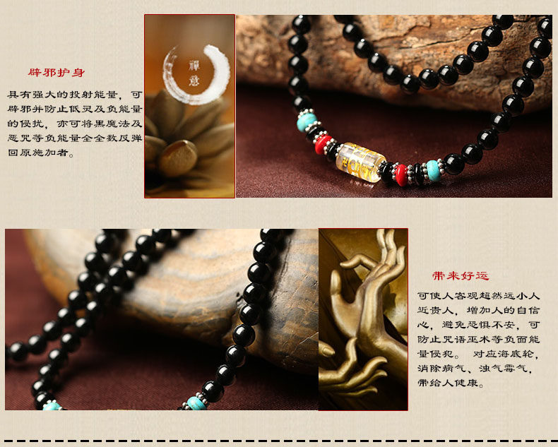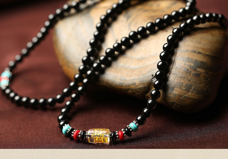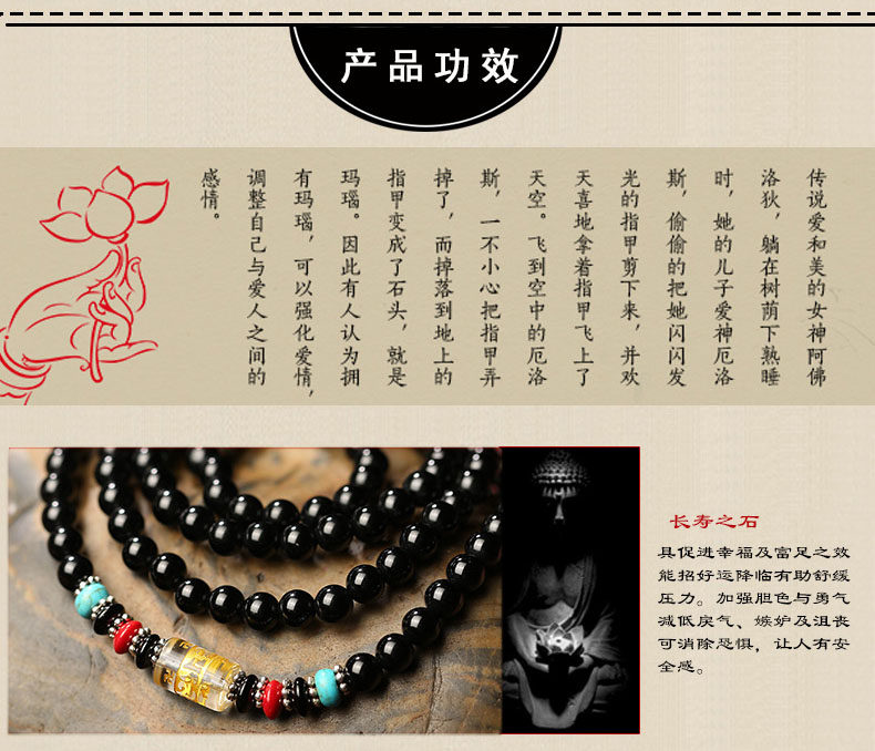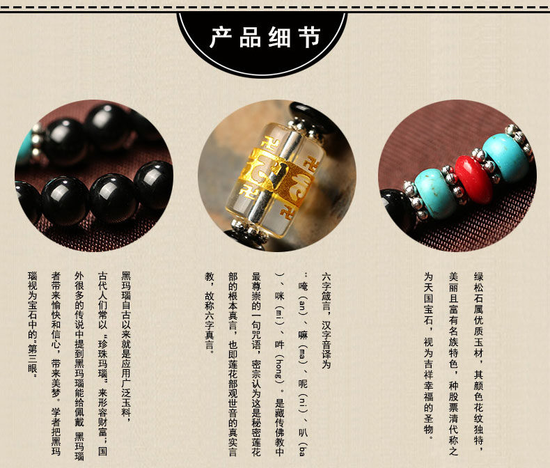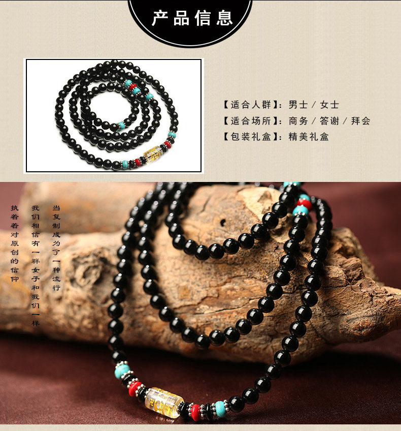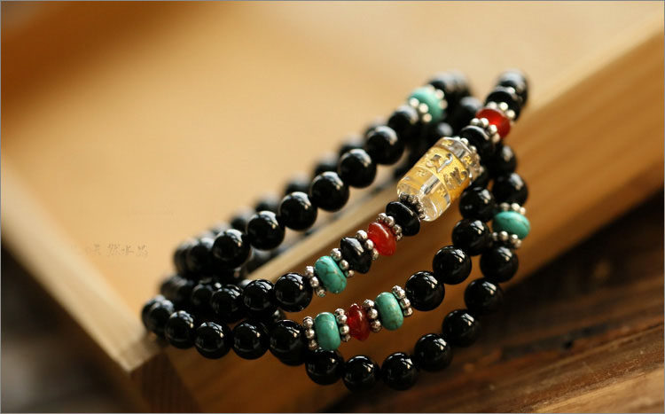 黑曜石六字真言佛珠多圈手链 男女款黑曜石水晶饰品