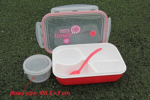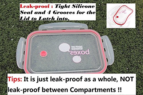 Leak-proof As a Whole with a Tight Silicone Seal (Tips:NOT Leak-proof Between Each Compartments )^3 compartments + 1 bowl with a capacity of 950 ml plus a GIVE-AWAY SPOON bento box.^FDA-approved and BPA-free; Heat and Cold Resistant; Environment-friendly
