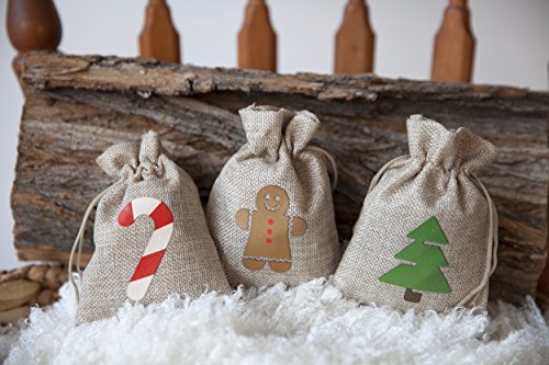 Christmas Treat Bags 12 Pack - 4" x 5 1/2" Burlap Treat Bags with Candy Cane, Gingerbread Man and Christmas Tree for Party Favors