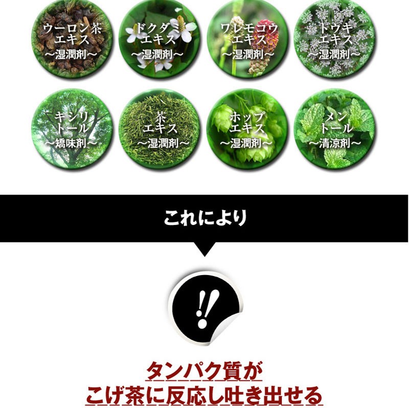 | 素材 | ●薬用成分:アラントイン、シメン‐5‐オール ●湿潤剤:ソルビトール液、茶エキス‐1、BG、トウキエキス‐1、ホップエキス、ワレモコウエキス、ウーロン茶エキス、ドクダミエキス ●清涼剤:エタノール、無水エタノール、メントール ●矯味剤:キシリトール、ステビアエキス ●可溶化剤:PEO(60)水添ヒマシ油 ●保存剤:メチルパラベン ●pH調整剤:無水クエン酸 ●着色剤:カラメル |