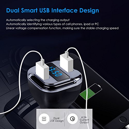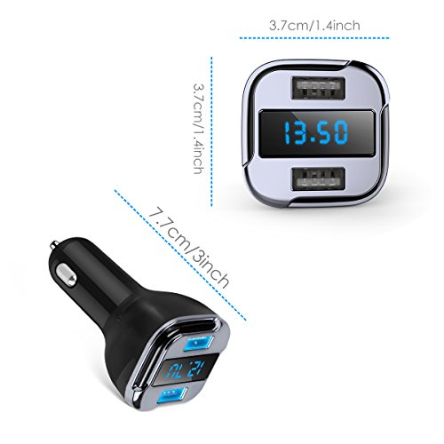 -. Feature : Delicate Design and Multifunctional: OLED blue light display and real-time battery voltage monitoring. Inserted smart chip provides short circuit protection, over current protection, the load voltage protection and multiple protection. / Smart Quick-charging: This USB car charger dual-port can automatically identify your device and provide the fastest charging speed. Two devices can be charged at the same time. / Strong Compatibility: Compatible with Android/Apple mobile devices, including iPhone X / 8 / 7 / 6s / 5 / SE / Plus, iPad Pro / mini / Air, Samsung Galaxy s8 / S7 / S6 / Edge / Plus, Note, BlackBerry, LG, Nexus, HTC, Lenovo, Xiaomi, Moto, Huawei and Camera / MP3 / PSP. / Charging Protection: Linear voltage compensation function let the charging speed more stable, stop automatically when the battery is fully charged. / GPS Location Tracker: Connecting your mobile phone app with car charger, automatically finding the parking position. And when you do not know the exact position of your car, so simply open the phone app to find it.
