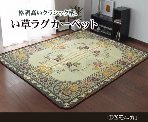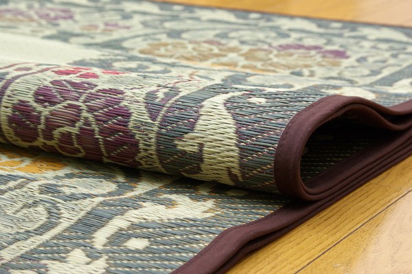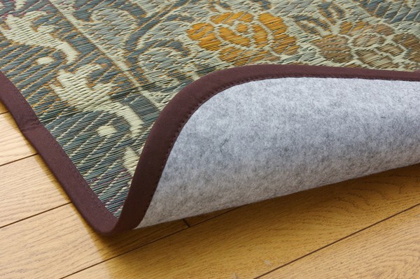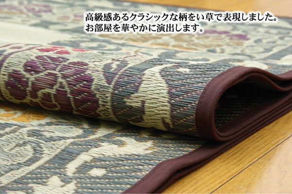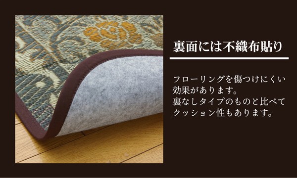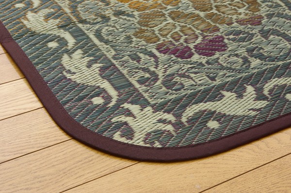 まるで絨毯のようなデザインを施したい草ラグです。い草には空気の自然浄化作用、湿度の調節作用などがあります。また汚れにくく、使用するうちに黄金色に変化し味が出ます。い草に青森ヒバ加工を施しています。(抗菌、防臭効果)フローリングを傷つけにくいよう、裏には不織布を貼っています。