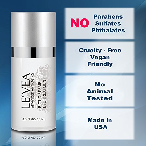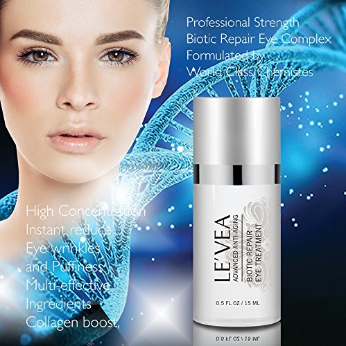 High concentration, instant reduce eye wrinkles and puffiness, multi-effective, collagen boost, cell restore and repair, vitamin c, e and green tea extract, lasting hydration and lifting*** features: Le'vea biotic repair eye treatment restore and repair anti-aging eye cream skin type: All skin type/anti-aging/mature no parabens, sulfates or phthalates. Cruelty-free and vegan friendly 0.5 fl oz. ph.: 5.80 product dimensions: 5 x 1.5 x 1.5 inches, 4 ounces product description: This super-charged, rich and highly features: Le'vea biotic repair eye treatment restore and repair anti-aging eye cream skin type: All skin type/anti-aging/mature no parabens, sulfates or phthalates. Cruelty-free and vegan friendly 0.5 fl oz. ph.: 5.80 product dimensions: 5 x 1.5 x 1.5 inches, 4 ounces product description: This super-charged, rich and highly concentrated luxurious eye wrinkle repair complex effectively flights against the signs and symptoms of chronological aging, deeply hydrating and nourishing the delicate eye area. Peptides of proprietary combination work effectively to repair cellular communication, boost the synthesis of collagen I, iii, iv for a visible reduction in the appearance of fine lines, eye wrinkles, under eye puffiness, dark circles. Powerful natural antioxidants and vitamins, our advanced formula help instantly reduce under eye wrinkles, eye puffiness and dark circles.Feature