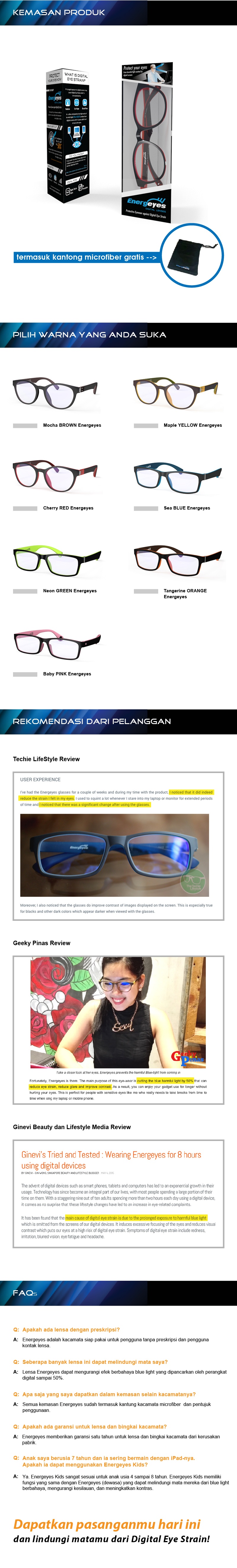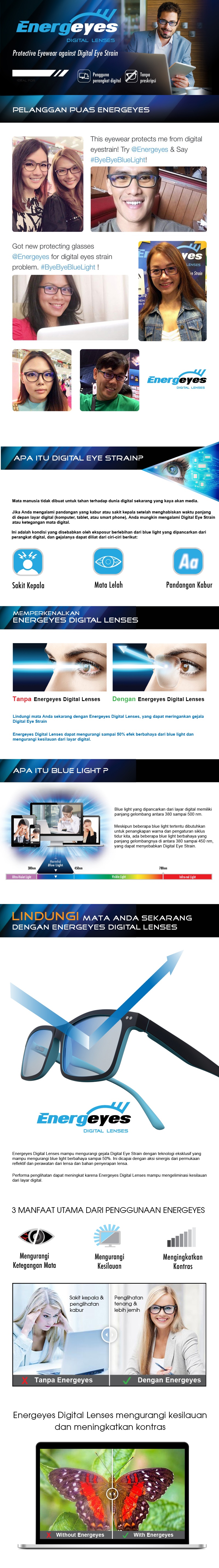 Kacamata Komputer ENEGERYES adalah kacamata siap pakai tanpa preskripsi yang dapat meringankan gejala Digital Eye Strain melalui teknologi yang mampu mengurangi sampai 50% efek berbahaya Blue Light. Eksposur berlebihan dari Blue Light yang berbahaya dapat menyebabkan Digital Eye Strain yang dipancarkan dari perangkat digital seperti laptop, smarphone, tablet, dan LED TV. Mata lelah, sakit kepala, sakit leher, dan pandangan kabur adalah ciri ciri dari Digital Eye Strain. Performa pandangan dapat meningkat dengan ENERGEYES Digital Lenses yang mengurangi kesilauan dan meningkatkan kontras dari layar digital.