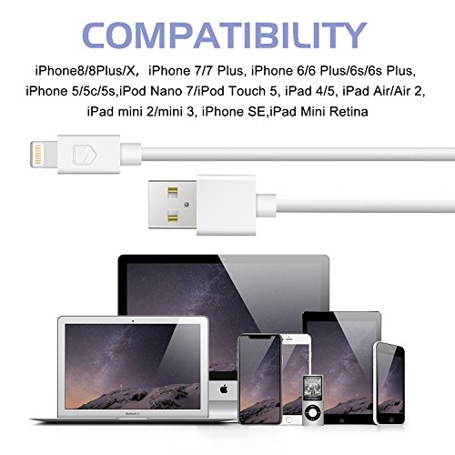 Studio : Sundix Publisher : Sundix Binding : Electronics Product Description Enhanced Performance and Safety Premium quality - Covered Lightning Charging cable, faster charge and data transfer, built-in chip set ensures safety for lightning devices. High-quality copper wire maximizes signal quality, ensures maximum performance Universal Compatibility? iPhone X/8/8 plus/7/ 7 plus, iPhone 5/ 5c/ 5s/SE, iPhone 6/ 6 Plus/6s/6s Plus, iPod Nano 7, iPod Touch 5, iPad4/Pro, iPad Air/ Air 2, iPad mini4/3/2, Mini Retina? NOT compatible with iPhone 4, iPad2, iPad 3, iPod Nano 6, iPod Touch 4 Package Contents 4Pack 6FT lightning cables in white color Extra Convenience 4packs give you more back-up choices in case that you cannot find your cable Standard Length Perfect 6ft length -- You can feel free to charge or sync your phone without worrying about the tangled cable Warranty Support? It comes with 12-month warranty and we provide long-term technical support, please feel free to contact us if you need any assistance Warm Tips a. Please do not wiggle the cable out of your device after finishing a charging?? b. Please ensure the power output do not exceed 2 A/ 5V or 6V/ 3A when charged with our lightning to USB cable?? c. Please avoid covering the charging cable or phone with any non-thermal covering, such as quilt, blanket?? d. please keep the connector dry and clean 0
