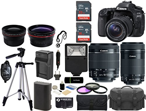 -. Feature : Kit Includes: Canon EOS 80D Full HD 1080p Video DSLR Camera Body + EF-S 18-55mm f/3.5-5.6 IS STM Lens + LP-E6N Lithium-Ion Battery Pack + LC-E6 Charger + EW-EOS80D Wide Camera Strap + Eyecup Eb + RF-3 Body Cap + Limited 1-Year Warranty / + Canon EF-S 55-250mm f/4-5.6 IS STM Lens + 58mm Wide Angle Lens + 58mm Zoom Telephoto Lens + Padded Camera Case + Spare LP-E6 Battery + Spare LC-E6 Charger + Sturdy Tripod + Auto Power Flash + Hand Grip + 3-piece Filter Kit + CapKeeper / SanDisk 32GB 320x High-Speed SDHC Class 10 Memory Card + SanDisk 16GB 320x High-Speed SDHC Class 10 Memory Card + Card Reader + Memory Card Wallet + Camera and Camcorder Cleaning Kit / 24.2MP APS-C CMOS Sensor - DIGIC 6 Image Processor - 3.0" 1.04m-Dot Vari-Angle Touchscreen - Full HD 1080p Video Recording at 60 fps / 45-Point All Cross-Type AF System - Dual Pixel CMOS AF - Expanded ISO 25600, Up to 7 fps Shooting - Built-In Wi-Fi with NFC - RGB+IR 7560-Pixel Metering Sensor