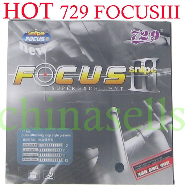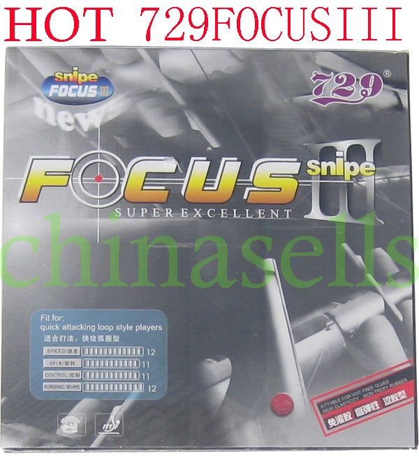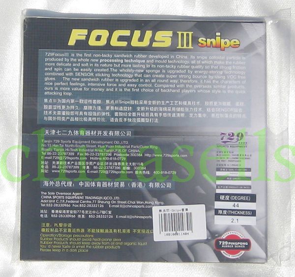 729Focus III is the first non-tacky sandwich rubber developed in china.its snipe colloidal particle is produced by the whole new processing technique and mould technology,all of which make the rubber more delicate and soft in its nature but more lasting to its non-tacky rubber quality so that strong friction and spin can be easily created.the wholely new sponge is upgraded by energy-storing technology combined with SENSOR sticking technology that can create super strong bounce by using VOC free glues. The new sandwich rubber is upgraded in an all round way,therefore,it has the characters of nice perfect feelings, intensive force and easy control. Compared with the overseas similar products,ours is more value for money and it is the first choice of backhand players whose style is the quick attacking loop.
