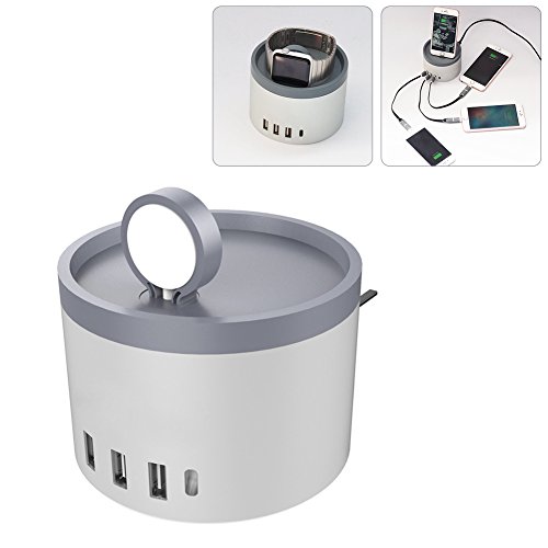 -. Feature : 5 PORTS MUTILFUTIONAL CHARGER DOCK: One inside USB port for the Apple Watch,four outside USB ports and one Type C for other devices / CABLE STORAGE: The inside space not only holds the apple watch charging cord, but also stores other little gadgets like USB adapters, card readers, etc,helping you to coil the watch charging cable in a neat appearance. / SMART IQ CHARGING TECHNOLOGY: Power IQ and voltage boost combine to charge up to 5V/2.4A Max per port for a total of 6 Amps, each port can automatically detects your device, allowing you to charge your Apple Watch and iPad, iPhone, other devices at the same time without any delay . / NIGHTSTAND MODE APPEARANCE: The stylish circular deck design allows the nightstand mode for you apple watch while charging with the charger dock,you can take full of advantage of your Apple Watch even when it is charging.