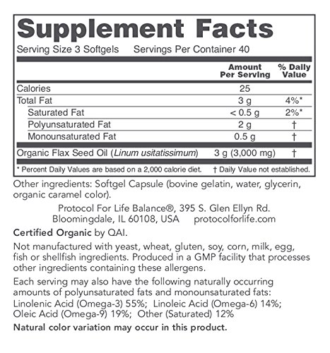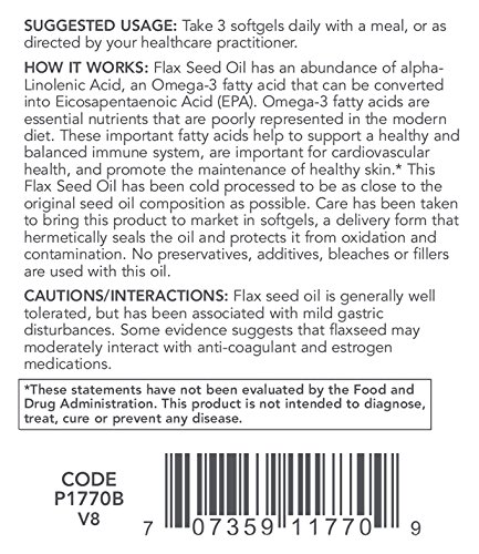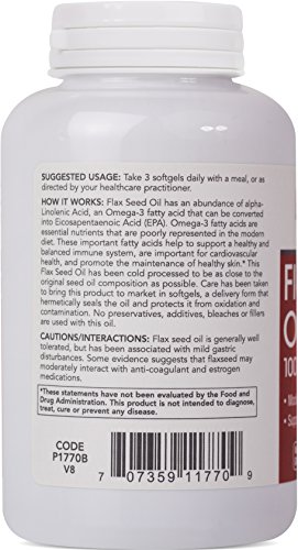 BENEFITS: Flax Seed Oil has an abundance of alpha-Linolenic Acid, an Omega-3 fatty acid that can be converted into Eicosapentaenoic Acid (EPA). Omega-3 fatty acids are essential nutrients that are poorly represented in the American diet. These important fatty acids help to support a healthy and balanced immune system, are important for cardiovascular health, and promote the maintenance of healthy skin.* This Flax Seed Oil has been cold processed to be as close to the original seed oil composition as possible. Care has been taken to bring this product to market in softgels, a delivery form that hermetically seals the oil and protects it from oxidation and contamination. No preservatives, additives, bleaches or fillers are used with this oil. Each serving may also provide the following naturally occurring amounts of polyunsaturated fats and monounsaturated fats:Linolenic Acid (Omega-3) 55% Linoleic Acid (Omega-6) 14% Oleic Acid (Omega-9) 19% Other (Saturated) 12% Flax Seed Oil has been specially processed and cold pressed to be as faithful to the original seed oil source as possible. This exceptional product comes in soft gels in order to seal the oil and protect it from oxidation and contamination.Feature