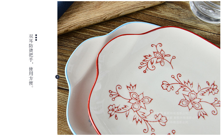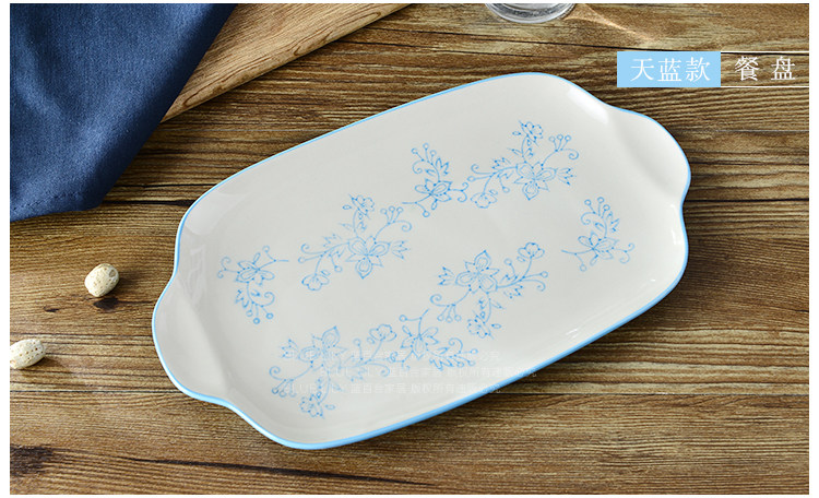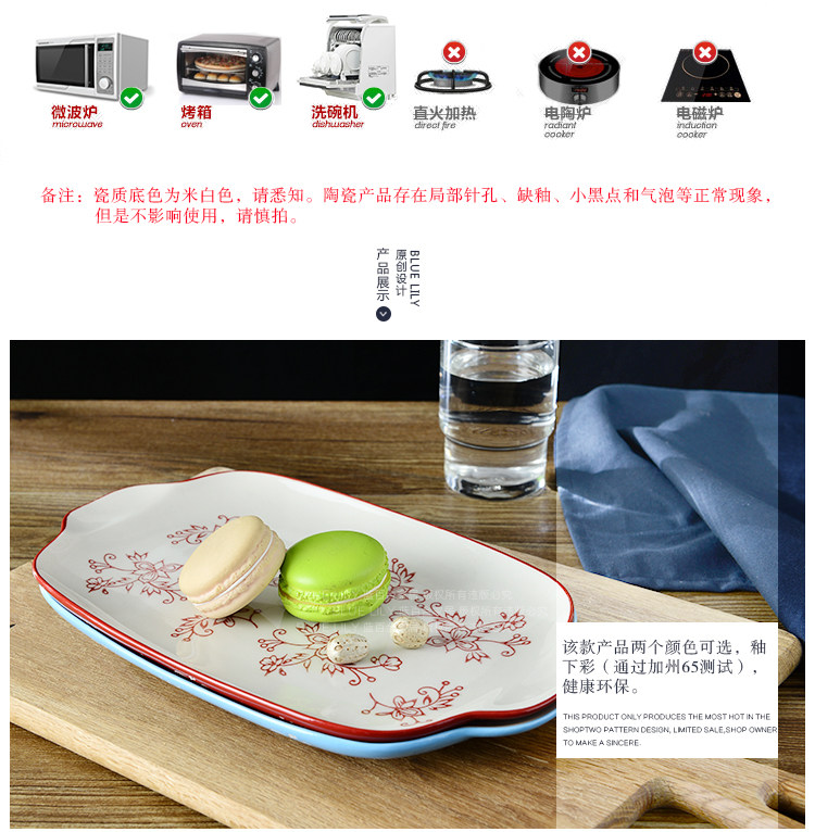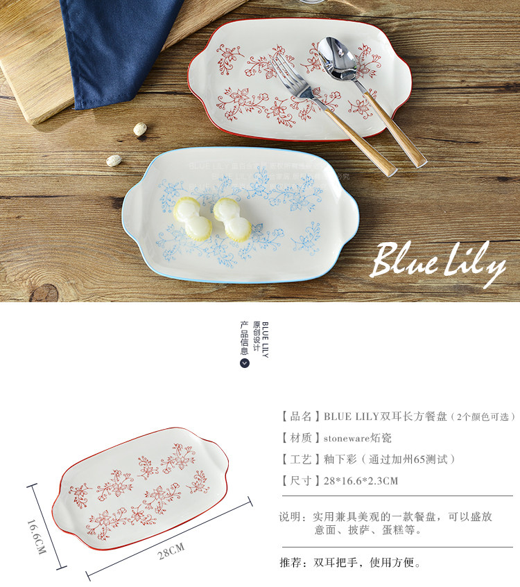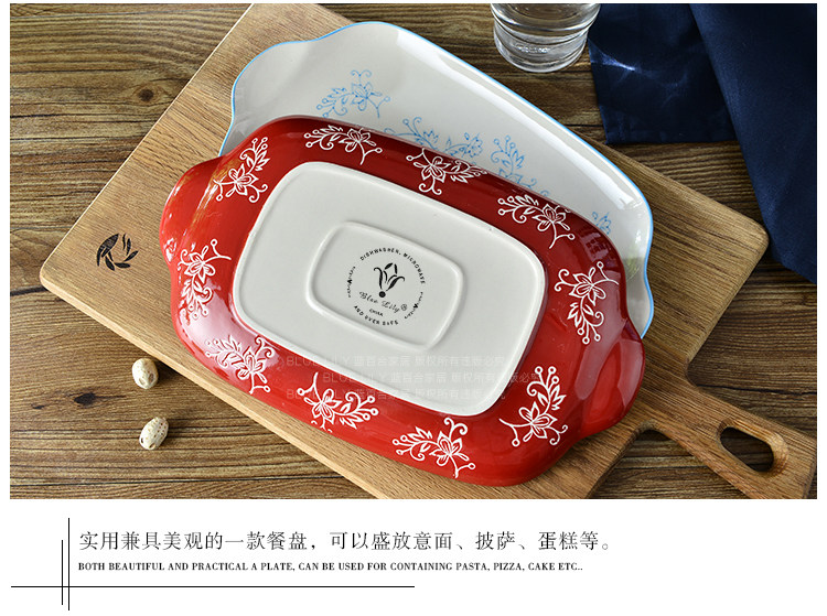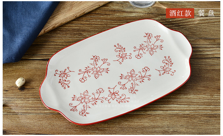 家居天蓝酒红系列纯手工釉下彩11英寸双耳餐盘鱼盘长方平盘