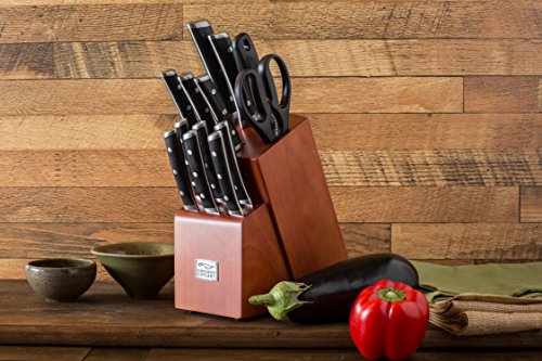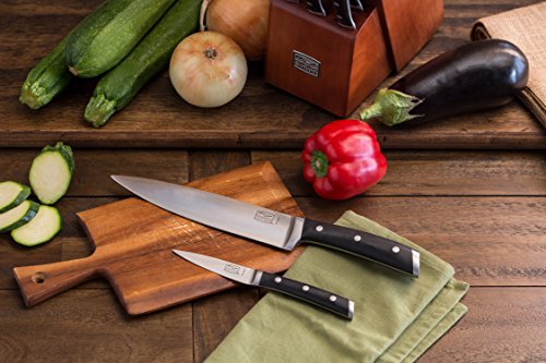 The Chicago cutlery Damen line is constructed of high-carbon stainless steel blades sharpened for precision cutting, and made to resist stains, rust, and pitting. The triple rivet polymer handle, and forged bolster, provide increased safety and stability. These knives are perfect for beginner chefs attempting to broaden their culinary horizons.