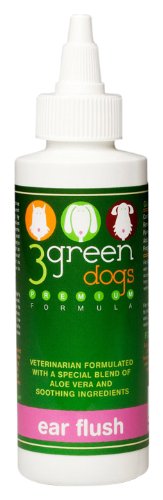 3 Green Dogs Ear Flush is an effective otic cleanser designed to help prevent canine ear infections. Formulated by veterinarians, this special combination of Aloe Vera and soothing ingredients facilitates the removal of wax, dirt, and other unwanted material from your dog's ears. This solution is gentle enough to be routinely used for the maintenance of dogs of all ages. Furthermore, it is enhanced with a pleasant fragrance to help keep your dog's ears smelling fresh.Feature