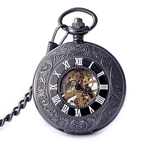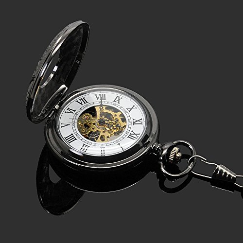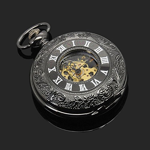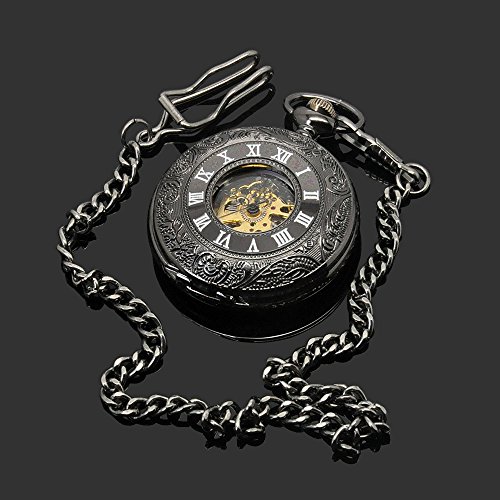 -. Feature : Unique skeleton dial with white roman numerals and hands / Black stainless steel case / Mechanical movement ( manual winding ) / 12-hour Dial / Includes 31cm chain
