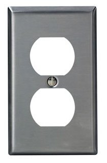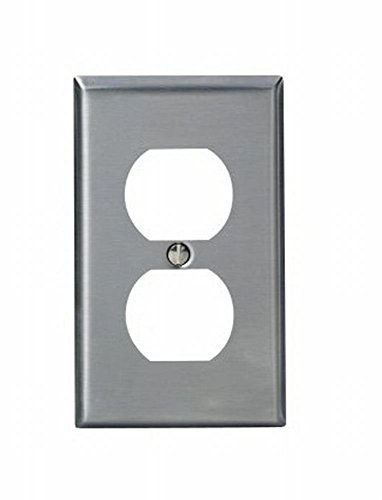 Leviton 004-84003-04 Single Gang Duplex Receptacle Wallplate, Stainless SteelLeviton 004-84003-04 Single Gang Duplex Receptacle Wallplate, Stainless Steel Features: Round on edges to prevent injury and wall damage Resistant to corrosive effects of sunlight and moisture Standard stainless steel is Type 343002, .032" thick Includes metal mounting screws that match plate color Commercial specification grade 1-gang duplex receptacle wallplateFeature