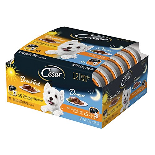 -. Feature : You get twenty four (24) 3.5-oz. trays of CESAR SUNRISE Breakfast and Dinner Mealtime Variety Pack Dog Food including (12) Grilled Steak & Eggs Flavor and (12) With Chicken & Liver / CESAR Canine Cuisine Breakfast Dog Food features delectable grilled steak and eggs and chicken and liver flavors for dogs with refined tastes at any time of day / This savory dog food is served in convenient trays with easy, peel-away freshness seals / CESAR SUNRISE Canine Cuisine is fortified with vitamins and minerals to help dogs of all sizes, especially small breeds, stay healthy / This gourmet dog food provides complete and balanced nutrition in a pate formulated for adult dogs