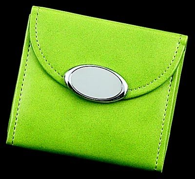 LIME GREEN LEATHERETTE TRI-FOLD PICTURE FRAME, HOLDS 3, 2" X 3" PHOTOS.