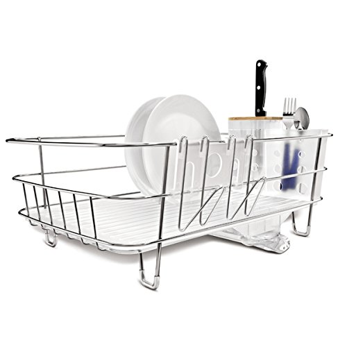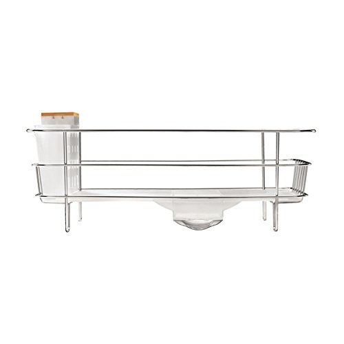 -. Brand : (simplehuman ) -. Color : Silver -. EAN : 0728295181333 -. Feature : Includes: One (1) dishrack Materials: Stainless steel, bamboo Removable stainless steel spout channels excess water for more efficient drainage / Rust-proof materials are durable, long-lasting, and won't rust or discolor Removable utensil holder: Fits on either side of the rack / Natural bamboo knife block: Stores knives safely and is gentle on sharp blades / Easy to clean: Utensil holder and wire frame are top-rack dishwasher safe; clean all other parts with warm, soapy water / Dimensions: 8.2 inches high x 12.7 inches wide x 19.5 inches deep -. Label : (simplehuman ) -. Manufacturer : (simplehuman ) -. ProductGroup : Kitchen -. ProductTypeName : KITCHEN -. Publisher : (simplehuman ) -. Size : 8.2 x 12.7 x 19.5 -. Studio : (simplehuman ) -. Title : simplehuman Slim Wire Stainless Steel Frame Dishrack with Removable Utensil Holder -. UPC : 728295181333