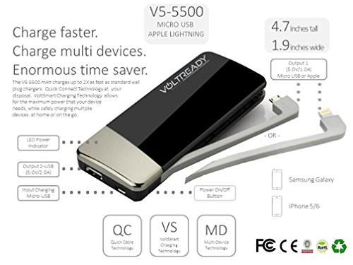 -. Title : Portable Power Bank - Built In Apple Lightning or Micro USB Charging Cable VoltReady V5 5500mAh External Battery Pack Charger For Apple iphone 6/6 plus/5/5c/5s or Samsung Galaxy, Nokia, Android and Other Devices - Slim, Lightweight, Durable, Auto Shut Off & LED Power Indicator Lights - Simplify Your Charging Experience Today!