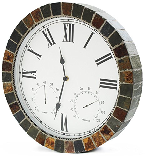 - Feature : Can be used indoors or outdoors / Made with beautiful textured ceramic rock tiles / Simple and elegant / Clock displays Time, humidity and temperature! / Requires one AA battery to operate and a two year warranty is included
