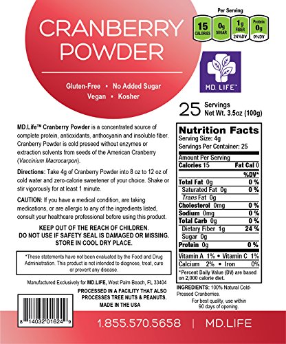 -. Feature : Save $$ MD Life Cranberry Powder 100g Compare To UTVital Cranberry Powder Save $$ / - Clean and pure powder - Laboratory proved for verification & guaranteed purity - Factory-sealed foil zip pouch - Promotes bladder health - Combats free radicals / - Pure Premium Organic Cranberry Powder - better than Freeze Dried -Very High Fiber Powerful - Concentrate Not Just Dried Fruit Powder / -Kosher, Vegan, Raw & GMO Free - Free of Contaminates, Heavy Metals, Chemicals & Pesticides / Natural Source of Phytonutrients, Great for vegetarians, Non Dairy, Great replacement for Soy or Whey sensitivity. !00% american Cranberries no Carriers added.