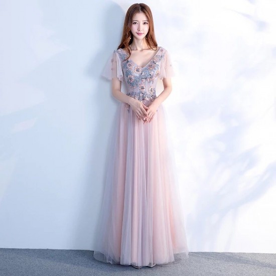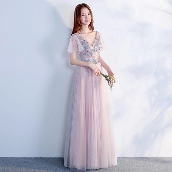パーティードレス ロング丈 マキシ ワンピース フラワーモチーフ ビーズ刺繍 フレア袖 エアリー Vネック 大人 上品 お呼ばれ drgz2237