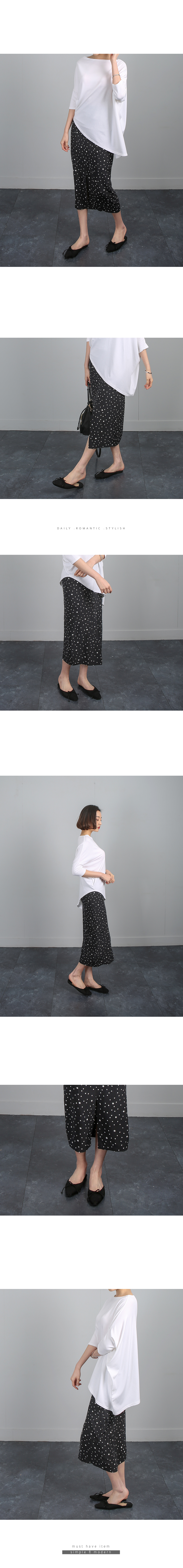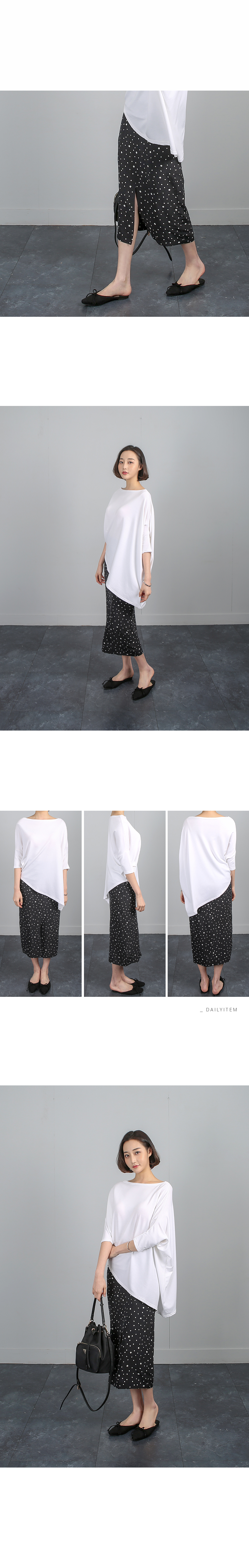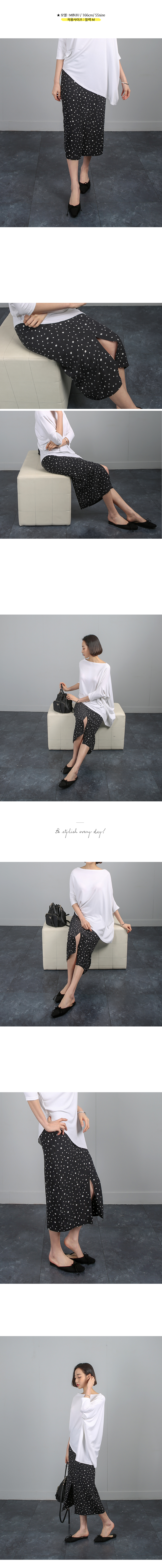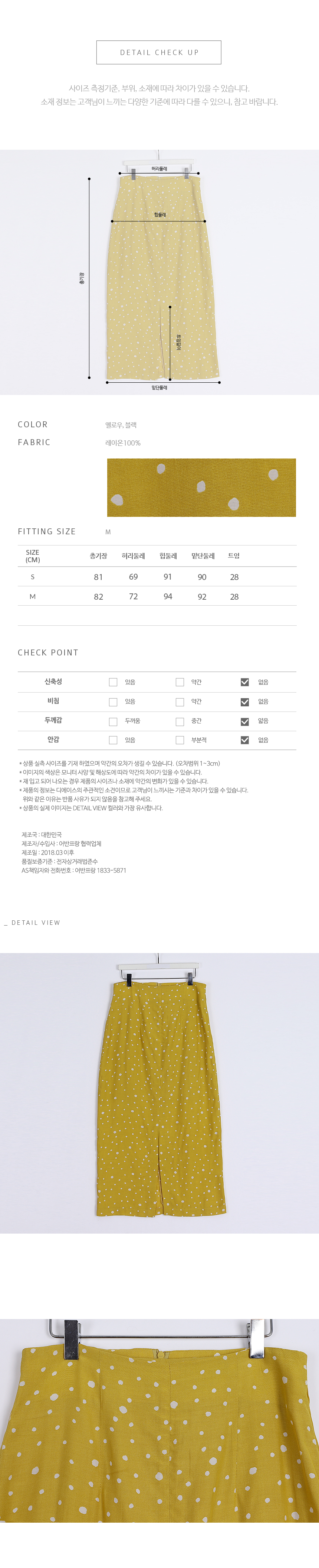 레이온100%로 부드럽고 찰랑이는 고급스러운 소재감이 돋보이는 도트 롱 스커트에요 앞중심에 트임이 있고 뒤지퍼로 클로징하는 스타일로 깔끔한 허리선이 상의를 넣어입어도 예뻐요 하늘하늘 슬림하게 떨어지는 핏에 롱한 길이감으로 크고작은 도트의 패턴이 리드미컬하면서 잘 어울려요 색상은 옐로우, 블랙 사이즈는 S,M ▼ 관련상품 : 여리핏 사선 티셔츠