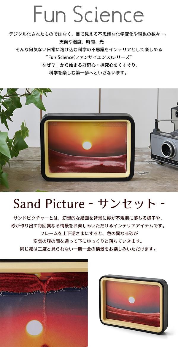 幻想的な絵画を背景に砂が不規則に落ちる様子や、砂が作り出す毎回異なる情景をお楽しみいただけるインテリアアイテムです。フレームを上下逆さまにすると、色の異なる砂が空気の膜の間を通って下にゆっくりと落ちていきます。 同じ絵は二度と見られない一期一会の情景をお楽しみいただけます。 |