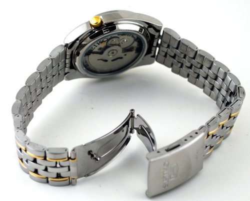 Stylishly dressed in silver and gold tones, the Seiko Men's Two Tone Stainless Steel Analog with White Dial Watch definitely deserves a closer look. This remarkable watch starts off with a round 39mm stainless steel case with a fixed stainless steel bezel and a gold-toned textured crown at the 4 'o clock position. These elements surround a pristine white dial, which is protected by a scratch-resistant hardlex crystal and features gold-toned index hour markers along with luminous gold-toned hands powered by automatic self-wind movement. The dial also offers a date display window at the 3 'o clock position. A stainless steel link bracelet accented by two gold-toned stripes straps this watch to the wrist, while a luxurious fold-over clasp ensures its secure placement. Finally, this watch boasts water resistance up to 99 feet (30 meters). A stately timepiece with a timeless design, this watch definitely deserves a place in your watch collection.Feature
