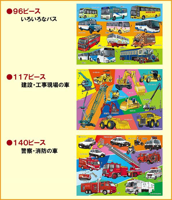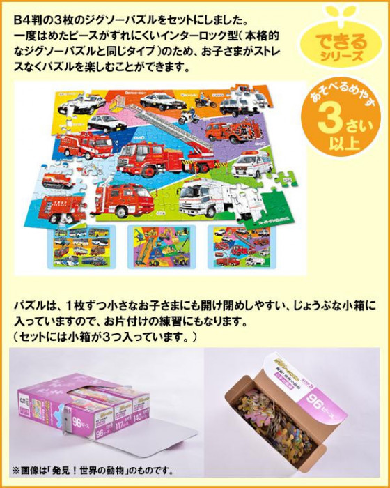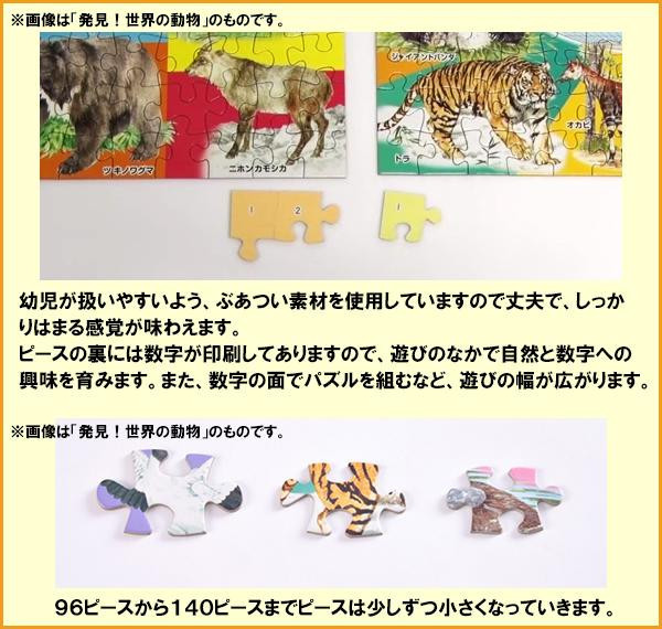 | 遊びながら学習につながる集中力と作業力を伸ばす、「スモールステップ」方式のジグソーパズルのセット。このSTEP5は、96ピースのパズルから、140ピースのパズルまで、合計3枚のジグソーパズルがセットされています。少しずつピースを増やしていくことで、パズルを完成させる達成感を味わいながら、集中力と作業力を高めていけます。 |