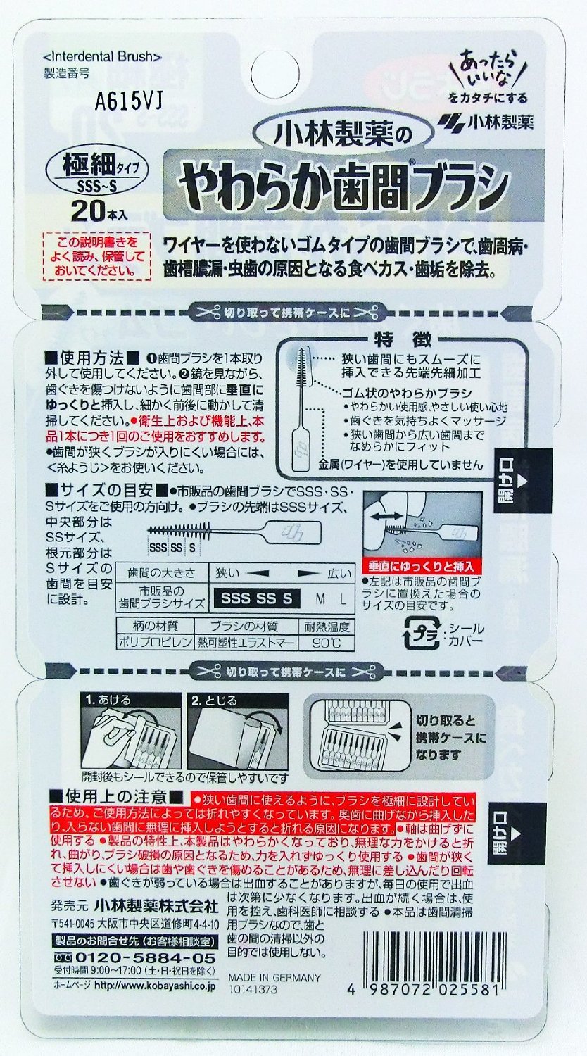 ● Interdental brush gentle to the gum without using wires ● Brushes with elastic microfine processing and stretchy rubber to smoothly fit between any teeth, massage the gum ● Gaps between narrow teeth