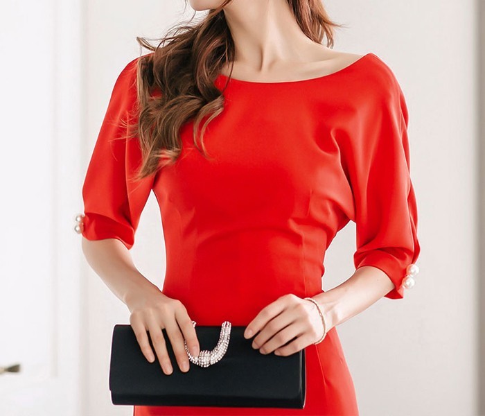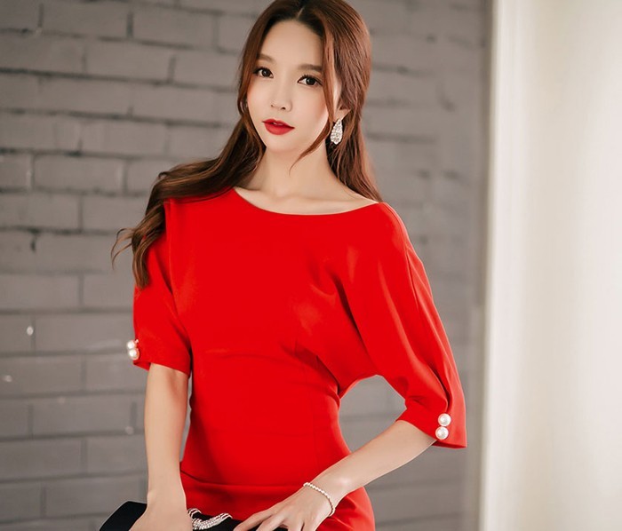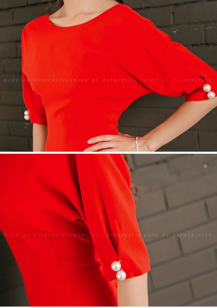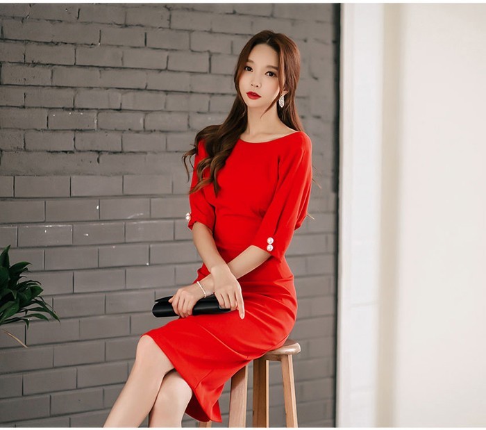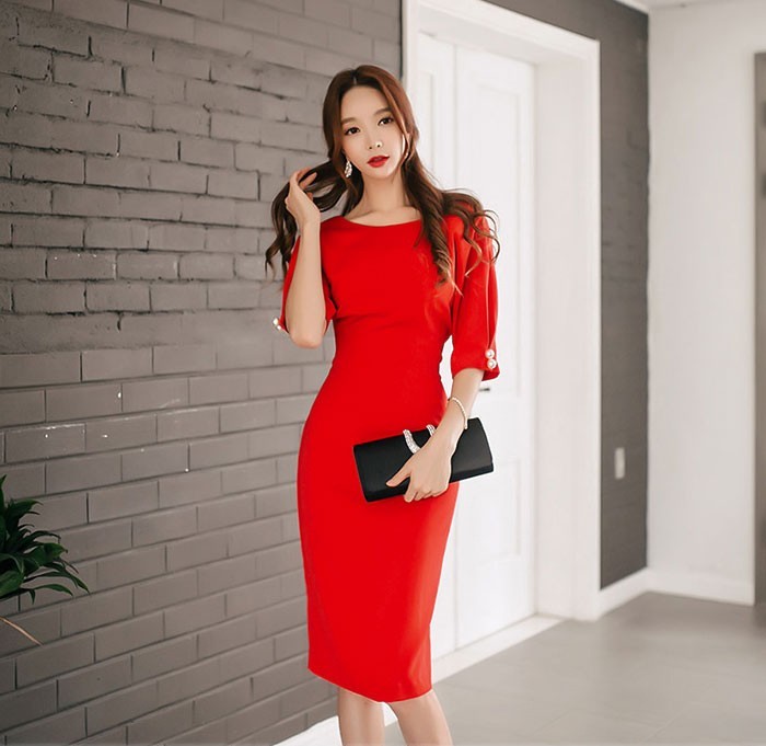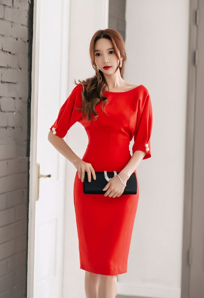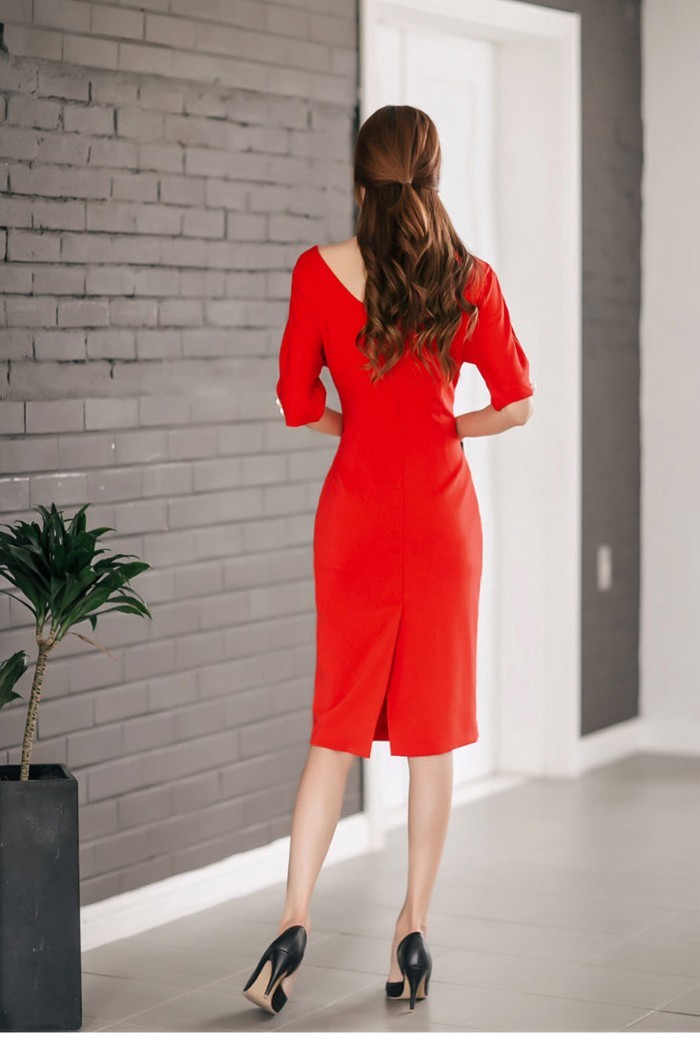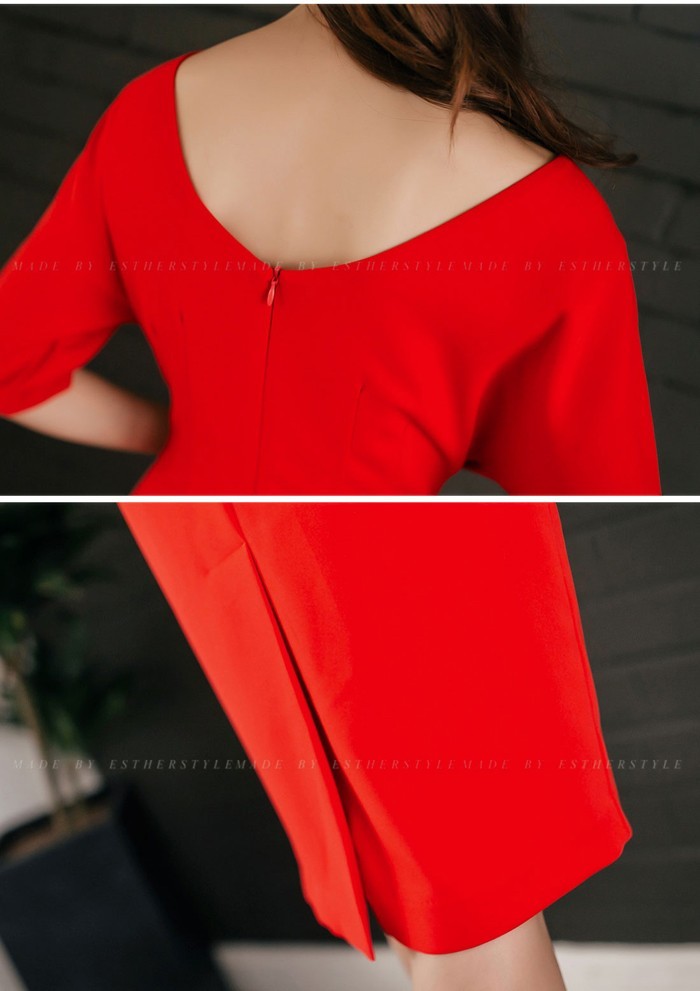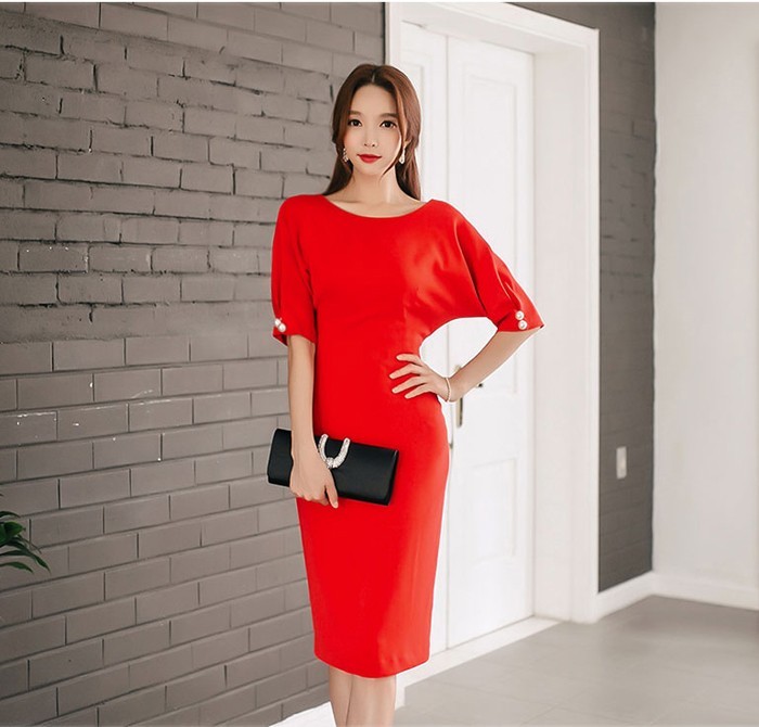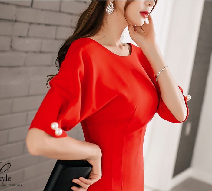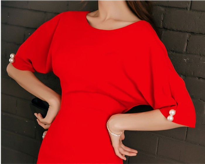 商品名:ワンピース タイトワンピ 無地 膝丈 半袖