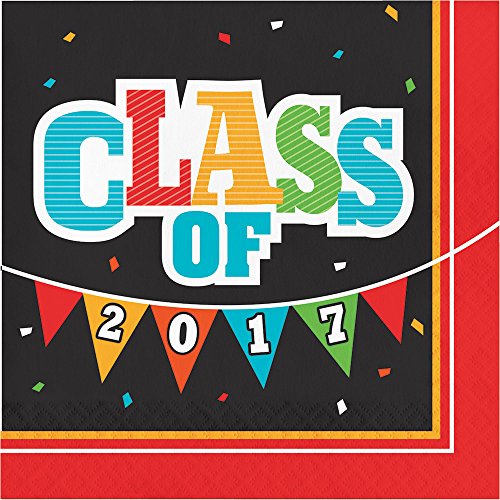- Black napkin with red border features design with bright, colorful flag banner and confetti, reads: Class of 2017