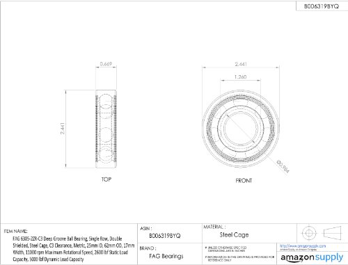 FAG 6305-2ZR-C3 Deep Groove Ball Bearing, Single Row, Double Shielded, Steel Cage, C3 Clearance, Metric, 25mm ID, 62mm OD, 17mm Width, 11000 rpm Maximum Rotational Speed, 2600 lbf Static Load Capacity, 5000 lbf Dynamic Load Capacity