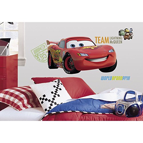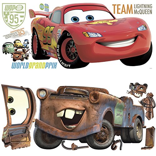 -. Binding : Toy -. Brand : RMK -. Color : RED/BROWN -. Feature : Assembled Size: McQueen: 31.5" W x 16" H. Mater: 24" W x 29.3" H / Very easy to apply, Just peel and stick! / Applies to smooth surface only! Texure wall is not recommanded! / McQueen is made by Vinyl and Mater is made by plastic. / Removable and repositionable with no sticky residue. -. PackageQuantity : 2 -. ProductGroup : Toy -. ProductTypeName : TOYS_AND_GAMES -. Title : Disney Pixar Cars 2 Lightning McQueen & Mater Peel and Stick Giant Wall Decal Bundle