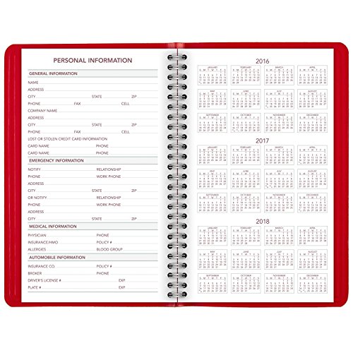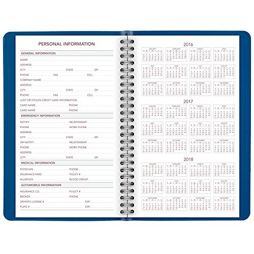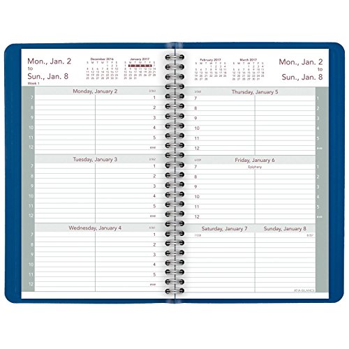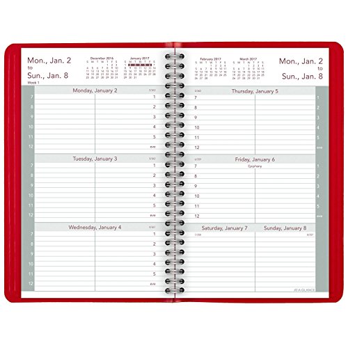 -. Feature : Available in assorted fashion colors, the covers of this weekly appointment book show off your personal style and help boost your mood. 12 month appointment book runs January - December so you can plan your year a week at a time. Julian dates. / One week per two page spread lists hourly, block-style appointment times for precise scheduling. Monday - Wednesday on the left page and Thursday - Sunday on the right page / Weekday appointment times from 7:00 a.m. - 5:00 p.m. Weekends allow greater flexibility with ruled, open scheduling on Saturday and Sunday. Please note color choice is not available to customer, the color will be selected at random for you. / Past, current and 2 future months reference calendar blocks also shown for quick date reference. Tabbed telephone / address section to keep contact information close / High quality paper resists ink bleed* and contains a minimum of 30% post-consumer recycled material. 4.88 x 8 inch page size. 5.44 x 5.31 x .56 inch overall size. Appointment book is wirebound and come in assorted cover colors - color selected may vary.
