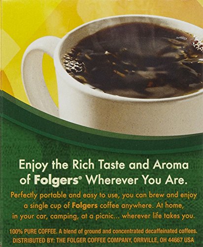 19 Single Servings. Freshly brewed by the cup. Brew a fresh cup every time. Folgers Coffee Singles are single-serving coffee bags made with mountain grown 100% pure coffee. They're specially designed so the coffee actually brews right in your cup - and each coffee bag is individually wrapped to help keep the coffee inside full of flavor. Folgers Coffee Singles - mountain grown coffee brewed one cup at a time. Enjoy the best part of waken up wherever you are. Folgers Coffee Singles are individually wrapped to help keep your coffee fresh, robust and full of flavor. So you can sip and savor Folgers rich, rewarding taste wherever you are. At home, in your car, on camping trips, fishing or even at a picnic. Perfectly portable and easy to use, you can conveniently brew a single cup wherever life takes you. 100% pure coffee naturally decaffeinated using only pure water and natural ingredients. 99.7% caffeine free.